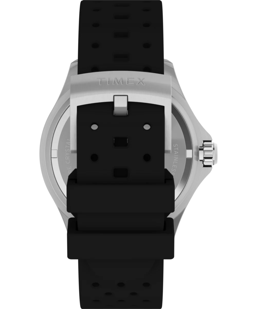 Merging resilience and elegance with crucial functions for underwater pursuits, our Deepwater Meridian 200 is expertly built to venture deeper. A substantial 44mm stainless-steel case, fortified with a screw-down crown and screw-on case back, effectively keeps water out and provides 200m of water resistance. This watch is powered by a reliable quartz movement, and we’ve equipped it with a sapphire crystal with anti-reflective coating, a sturdy crown protector, a magnified date window, a unidirectional ratcheting top ring, and Super-Luminova® hands and hour markers providing the luminosity you rely on as you venture below. A unique wave pattern brings dimension to the black dial, while a perforated black synthetic rubber strap ensures durability, comfort, and style both in and out of the water.
