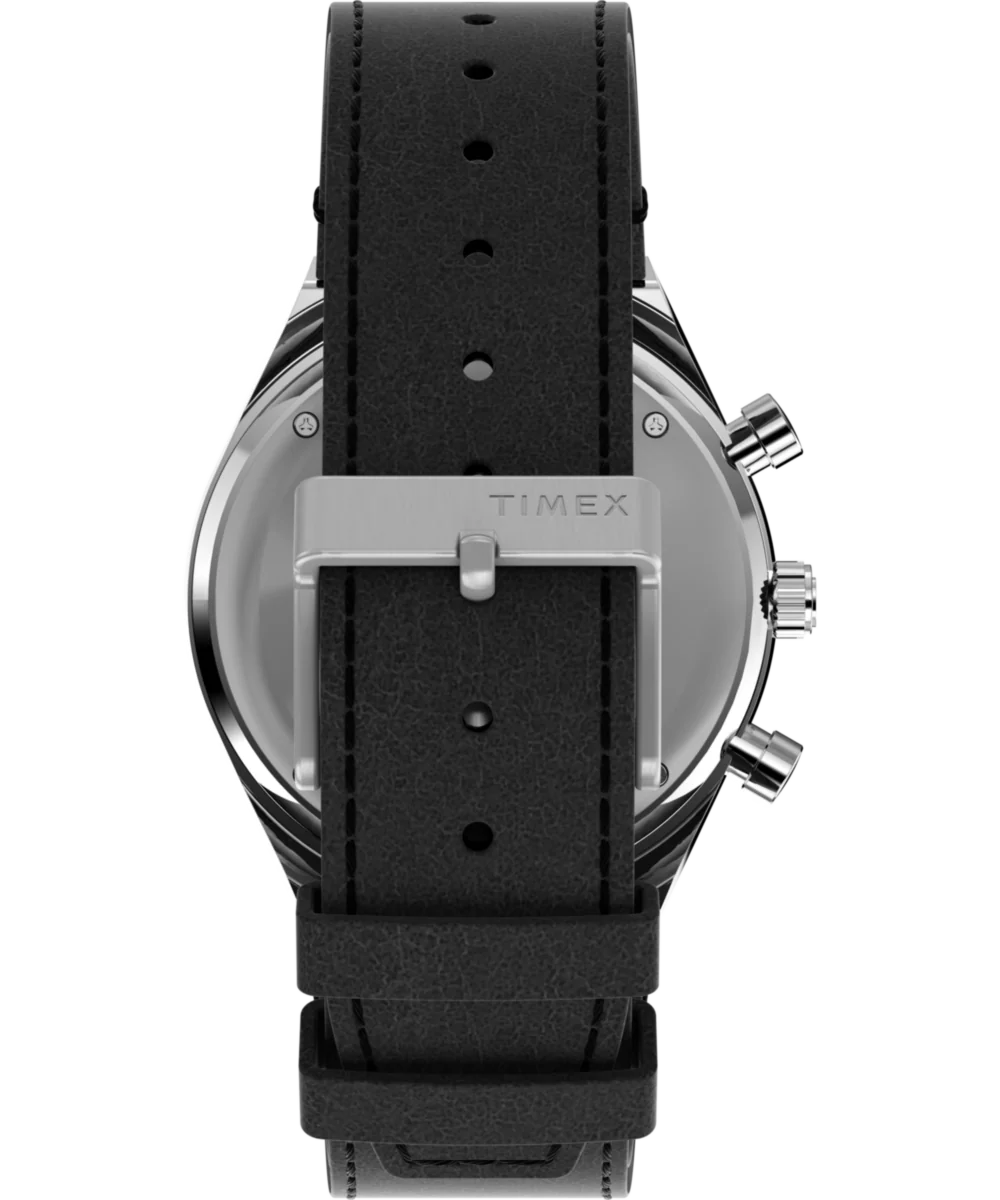 Roar across the finish line with our high-performing Q Timex Chronograph. Inspired by the original motoring watches that graced the tracks of Europe’s most iconic races, this timepiece celebrates the endurance of our legendary 1970s Q Timex. An ultra-precise chronograph movement and black tachymeter bezel recreate the finesse and function of a true racing watch, allowing you to determine elapsed time and average speed like the greatest daredevils in motorsports. Contrasting sub-dials, a date feature, hand-applied dimensional indices, and an updated Q Timex logo smolder against a jet-black dial, while a brushed and polished stainless-steel case and crown bring dynamism and durability to its retro construction. Infinitely wearable, a black leather strap with quick-release spring bars makes for a sporty presentation that’s ready to hit the road whenever you are.