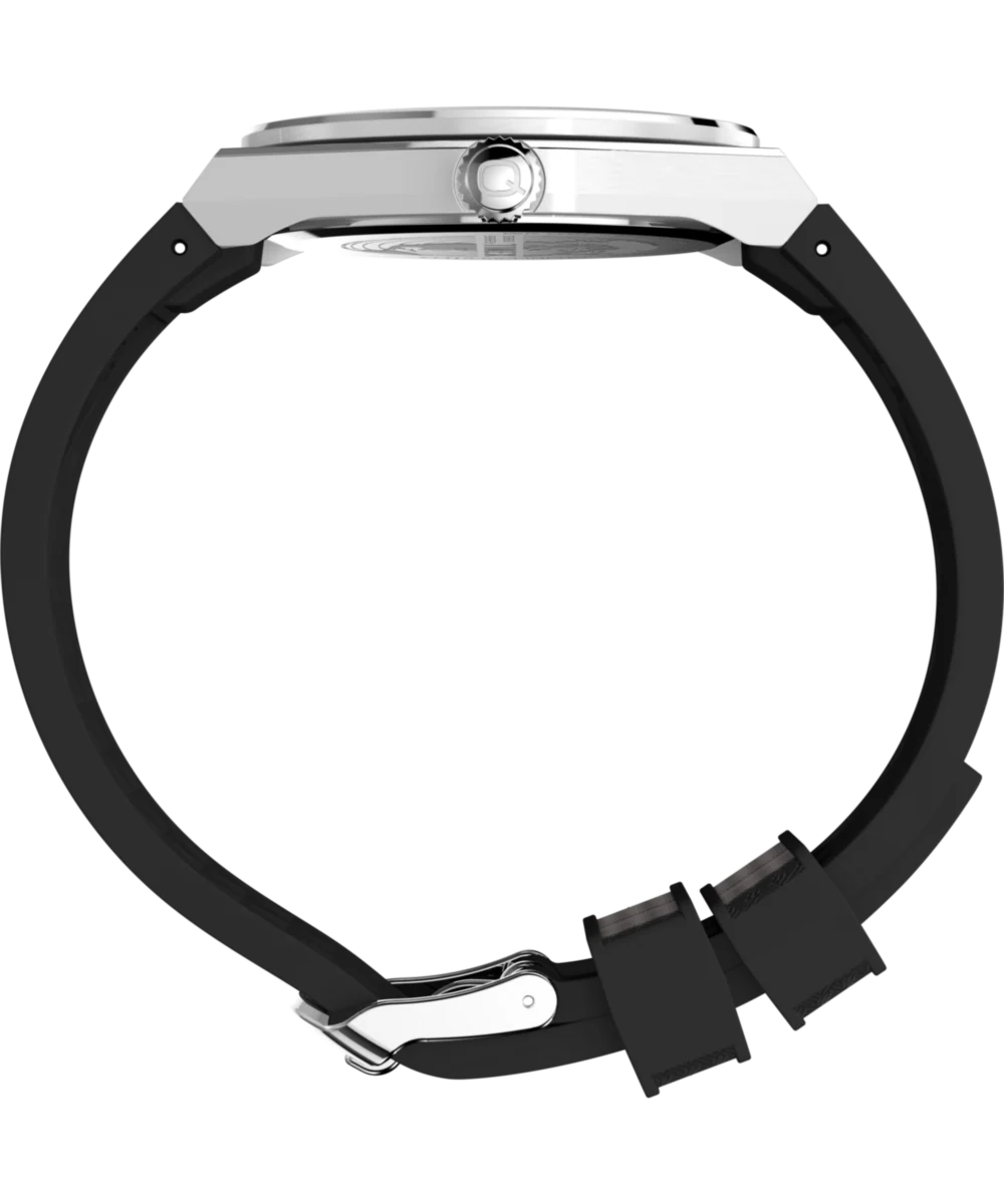Channeling the bold designs and decadent glamour that filled the scene in ‘70s West Hollywood, the Q Timex® Continental GMT brings refinement to our beloved Q Timex collection with a new streamlined 39mm brushed stainless-steel case with polished edges and a sleek GMT window at 6 o’clock. The simple black or silver-tone dial features a radial texture and a clean presentation that’s effortlessly cool, highlighted by faceted hour markers, luminant hands for enhanced visibility in the dark, and a glanceable date window beside the 3rd hour marker. The textured black synthetic rubber strap that’s perforated makes for a more laid-back look as you let the hours slip away.